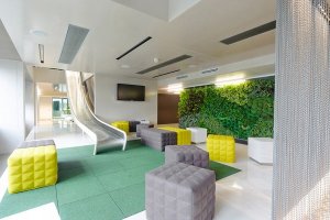 You probably wouldn’t believe us if not for the picture above, but there are even slides in some rooms to go down a floor! You’ll also see square puff chairs in three different colors: white, green, and gray. The nice thing about these kinds of chairs is that they’re easy to move, which makes them a very flexible seating option.
